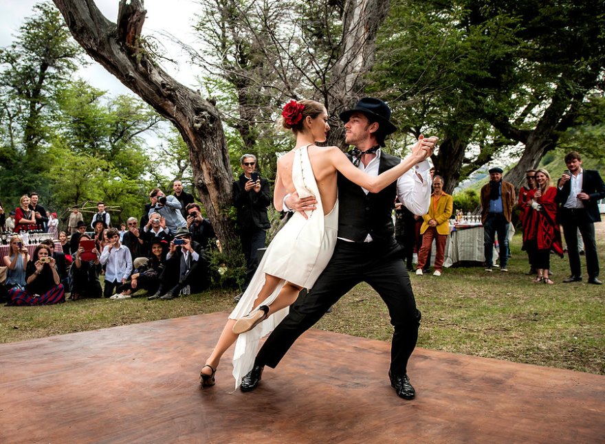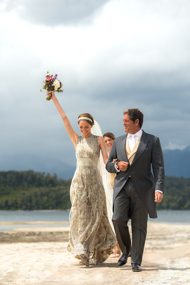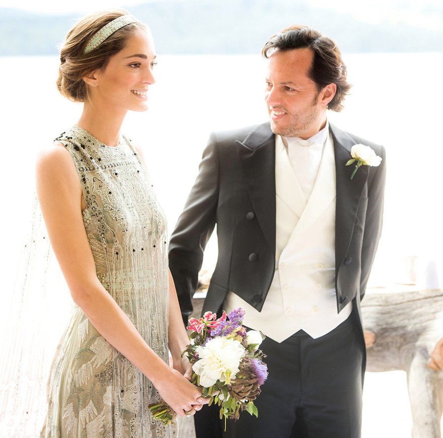 The groom sported white tie and tails which was custom Berluti. The bride arrived on the bow of the wooden speedboat in her custom Valentino dress (that took 1,800 hours worth of bas-relief pearl and crystal embroidery). They later had a cumbia dance party, which took place in a barn in the lakeside town of Villa La Angostura, where the bride dawned (not one but two) Rodarte dresses. A floor skimming silk, tulle, and lace dress with winglike sleeves and silver-and-cream embroidered flowers, and the second a short feather-embroidered white lace-and-iridescent sequin frock.