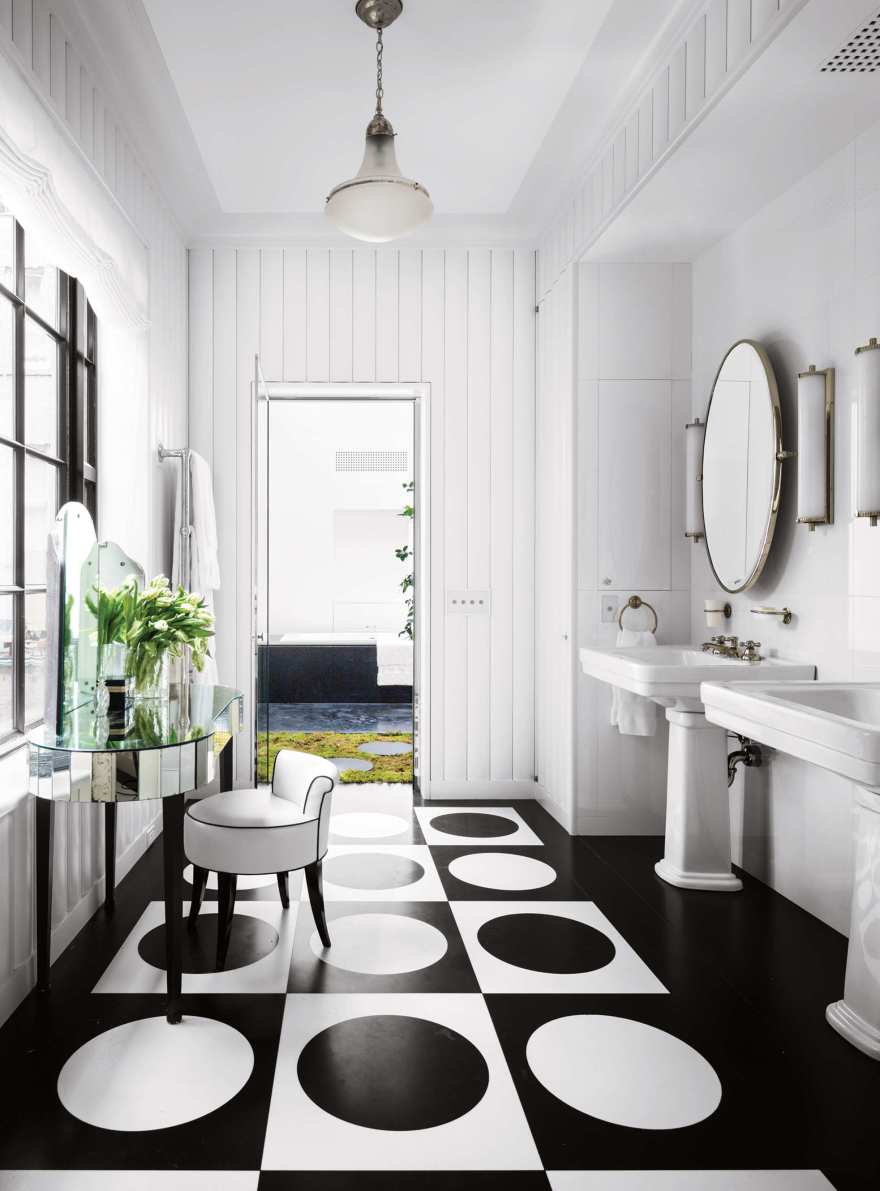 This uptown mansion is full of surprises, featured in The Cut you can see that each room has its own characteristics. The master bath definitely is channeling a bit of Dorothy Draper with the bold black and white tile!